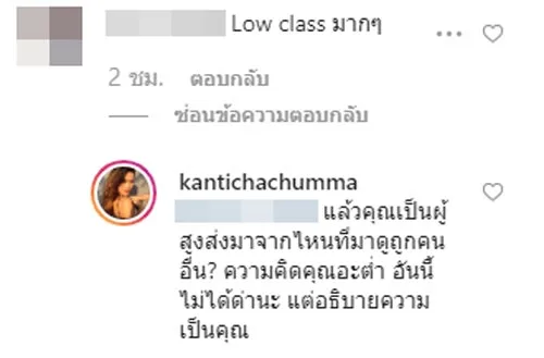 จนกระทั่ง กลายเป็นกระแสดราม่าเบาๆ หลังจากที่มีคนเข้ามาคอมเมนต์ตำหนิ สาวติช่าว่า “Low class มาก ๆ” ทำเอาติช่า ตอกกลับอย่างว่า ” แล้วคุณเป็นผู้สูงส่งมาจากไหนที่มาดูถูกคนอื่น ? ความคิดคุณอะต่ำ อันนี้ไม่ได้ด่านะ แต่อธิบายความเป็นคุณ” งานนี้่แฟนๆแห่เข้ามากดไลค์กันเพียบ พร้อมทั้งบอกว่า “การที่คุณจะมาต่อว่าคนอื่นที่ไม่ได้ทำผิดอะไร คุณต่างหากที่ไม่มีมารยาท”