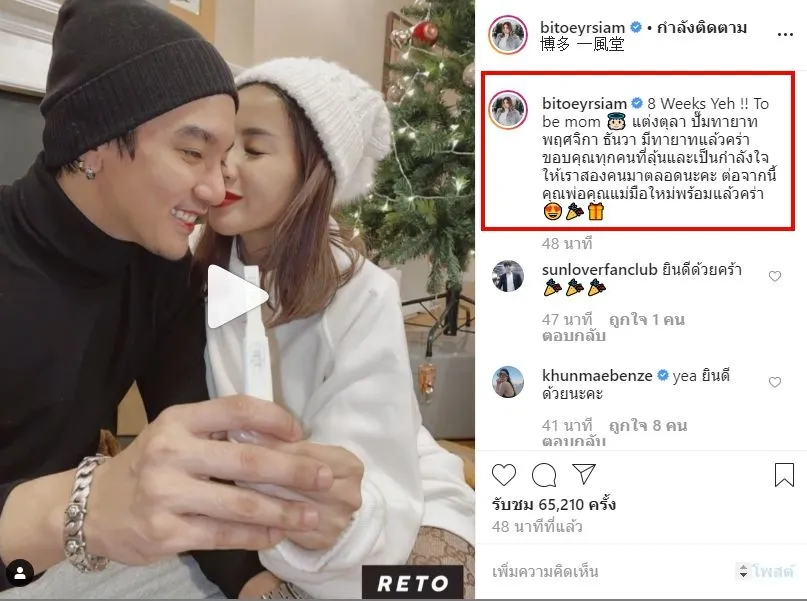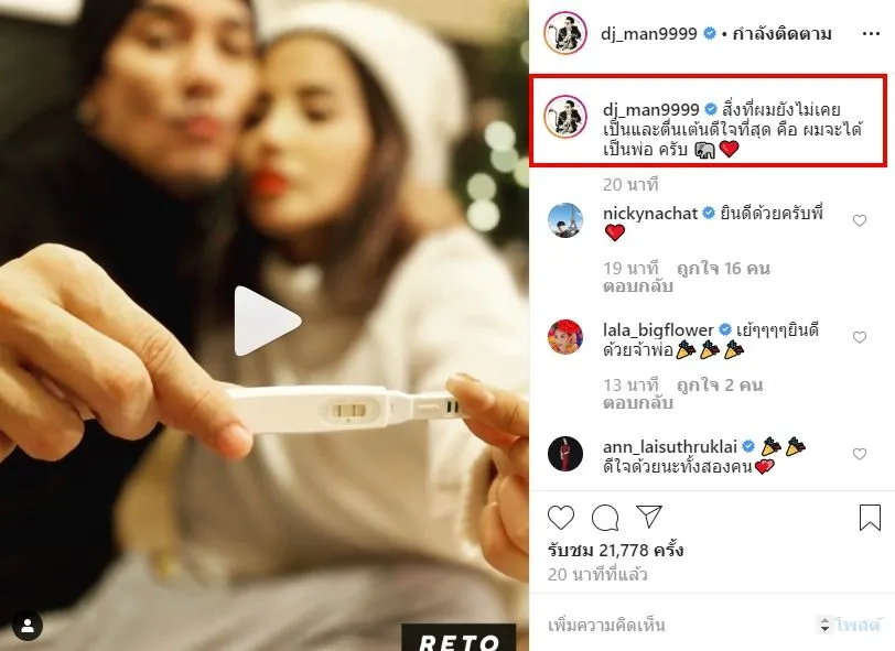 อีกทั้งทางด้าน สาวใบเตย นั้นก็ได้เคลื่อนไหวกลางไอจีเเล้ว หลังสามี ดีเจเเมน ได้ประกาศข่าวดี ซึ่งงานนี้ สาวใบเตย ได้โพสต์รูปภาพถือที่ตรวจครรภ์ขณะตั้งท้องได้ 2 เดือน เเละระบุข้อความว่า 8 Weeks Yeh !! To be mom แต่งตุลา ปั๊มทายาท พฤศจิกา ธันวา มีทายาทแล้วคร่า ขอบคุณทุกคนที่ลุ้นและเป็นกำลังใจให้เราสองคนมาตลอดนะคะ ต่อจากนี้คุณพ่อคุณแม่มือใหม่พร้อมแล้วคร่า