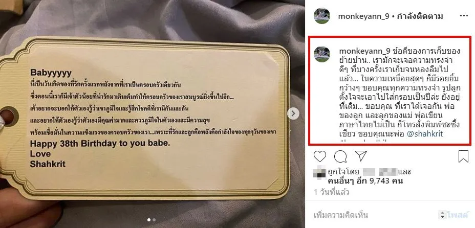 โดย สาวแอน ได้ระบุข้อความว่า ข้อดีของการเก็บของย้ายบ้าน.. เรามักจะเจอความทรงจำดีๆ ที่บางครั้งเราเก็บจนหลงลืมไปแล้ว… ในความเหนื่อยสุดๆ ก็มีรอยยิ้มกว้างๆ ขอบคุณทุกความทรงจำ รูปลูกตั้งใจจะเอาไปใส่กรอบเป็นปีล่ะ ยังอยู่ที่เดิม… ขอบคุณ ที่เราได้เจอกัน พ่อของลูก และลูกของแม่ พ่อเขียนภาษาไทยไม่เป็น ก็โทรสั่งพิมพ์ซะซึ้งเชียว ขอบคุณนะพ่อ @shahkrit #loveubodhiboy นั่นเอง