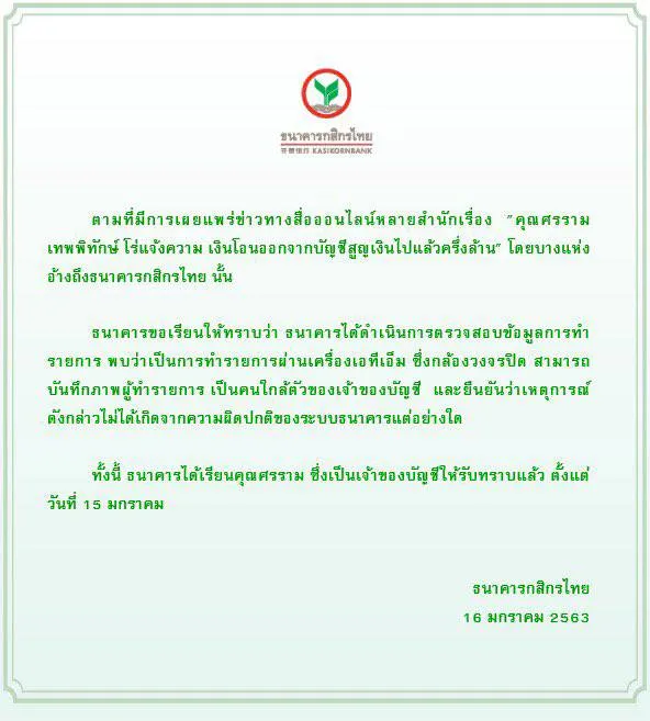 ล่าสุด ธนาคารกสิกรไทย กรณีศรรามแจ้งความตำรวจเงินในบัญชีหายกว่าครึ่งล้าน ในแถลงการณ์บอกไม่พบการหายของเงิน แต่มีการกดผ่านตู้ ATM กล้องวงจรปิดจับภาพได้เป็น คนใกล้ชิดศรราม