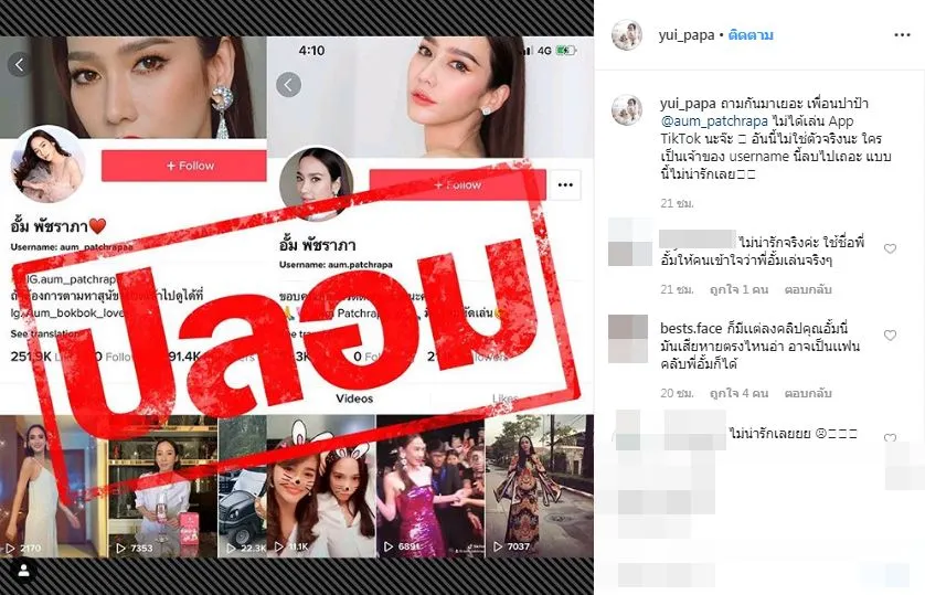 โดยงานนี้เพื่อนซี้อย่าง ยุ้ย ก็รีบเข้ามาคอมเมนต์ออกโรงชี้แจงว่า ถามกันมาเยอะ เพื่อนปาป้า @aum_patchrapa ไม่ได้เล่นแอป TikTok ว่าอันนี้ไม่ใช้ตัวจริงน่ะจ๊ะ ใครเป็นเจ้าของ Usernameนี้ รีบลบไปเถอะ แบบนี้ไม่น่ารักเลย