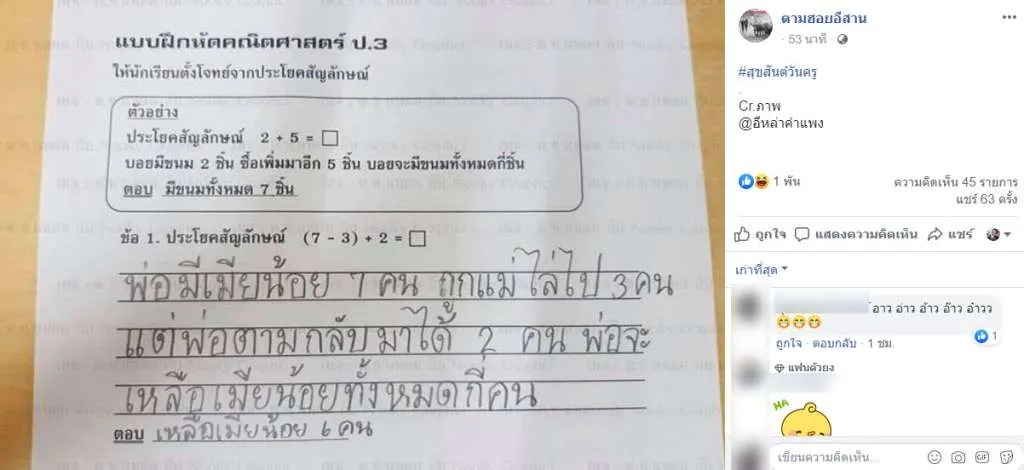 โดยแฟนเพจ ตามฮอยอีสาน ได้โพสต์ภาพแบบฝึกหัดวิชาคณิตศาสตร์ของนักเรียกประถมศึกษาปีที่ 3 พร้อมทั้งระบุแคปชั่นเพียงสั้นๆ ว่า “สุขสันต์วันครู” ซึ่งในแบบฝึกหัดนั้น คือให้นักเรียนตั้งโจทย์จากประโยคสัญลักษณ์ ซึ่งในโจทย์ที่ให้มานั้นคือ (7 – 3) + 2 = ?