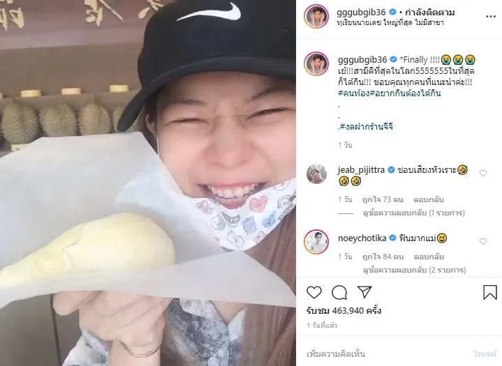 ล่าสุดทางด้าน สาวกุ๊บกิ๊บ นั้นอยากกินทุเรียน จนต้องออกมาประกาศตามหากันกลางไอจีเลยทีเดียว ด้านสามีดีเด่นอย่าง หนุ่มบี้ ก็รีบไปหามาให้ Finally !!!! เย้!!!สามีดีที่สุดในโลก5555555ในที่สุดก็ได้กิน!!! ขอบคุณทุกคนที่แนะนำค่ะ!!! คนท้อง อยากกินต้องได้กิน