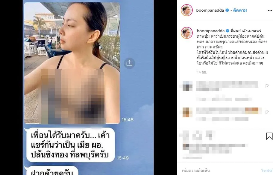 โดยบุ่ม กล่าวว่า… “มีคนกำลังเผยแพร่ภาพบุ๋ม หาว่าเป็นภรรยาผู้ต้องหาคดีปล้นทอง ขอความกรุณางดแชร์ด้วยนะคะ คืองงมาก ภาพตูชัดๆ ใครที่ได้รับในไลน์ ช่วยด่ากลับคนส่งด่วน!!! ที่จริงมีคลิปผู้หญิงอาบน้ำก่อนหน้า แต่จะใช่หรือไม่ใช่ ก็ไม่ควรส่งต่อ ละเมิดมากๆ”