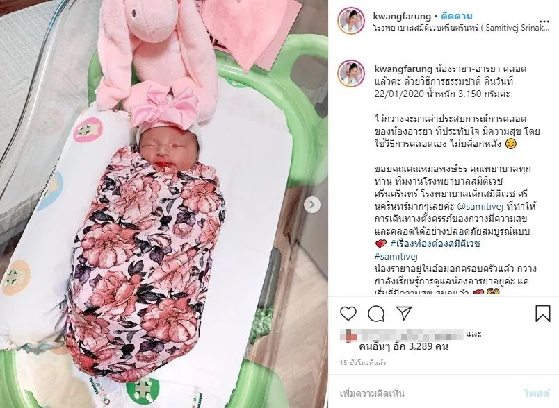 “น้องรายา-อารยา คลอดแล้วค่ะ ด้วยวิธีการธรรมชาติ คืนวันที่ 22/01/2020 น้ำหนัก 3,150 กรัมค่ะ ไว้กวางจะมาเล่าประสบการณ์การคลอดของน้องอารยา ที่ประทับใจ มีความสุข โดยใช้วิธีการคลอดเอง ไม่บล็อกหลัง น้องรายาอยู่ในอ้อมอกครอบครัวแล้ว กวางกำลังเรียนรู้การดูแลน้องอารยาอยู่ค่ะ แค่เริ่มก็มีความสุข สนุกแล้ว welcomebabyaraya”