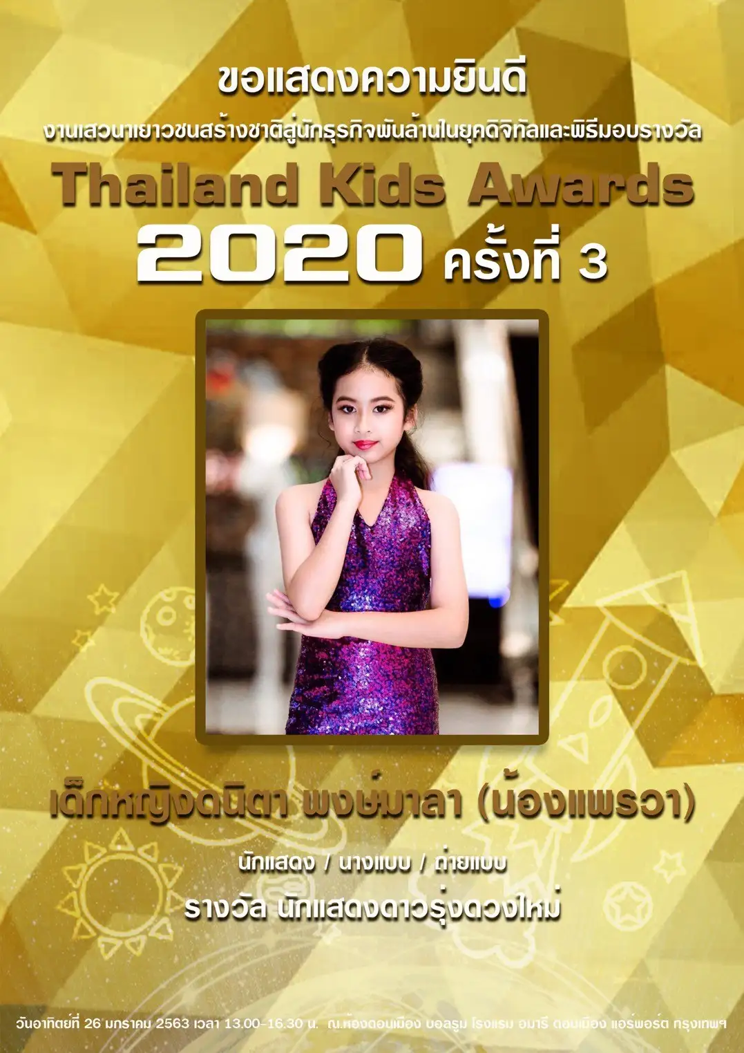 ครอบครัวสุดปลื้ม น้องแพรวา หรือ ดนิตาพงศ์มาลา นักแสดงเด็ก จากซีรี่With Love The Series รักต่อไม่รอแล้วนะ เดินตามรอย รุ่นพี่ ชบาแก้วThailand's Got Talent เข้ารับรางวัล ดาราเด็ก ภาย ในงาน เสวนาเยาวชนสร้างชาติสู่อาชีพธุรกิจพันล้านในยุคดิจิตอลและพิธีมอบรางวัล Thailand Digital Awards2020 และรางวัล Thailand Kids Digital Awards 2020 ครั้งที่ 3 เมื่อ วันอาทิตย์ที่ 26 มกราคม 2563 ที่ผ่านมา ณโรงแรมอมารี ดอนเมือง แอร์พอร์ตกรุงเทพฯ