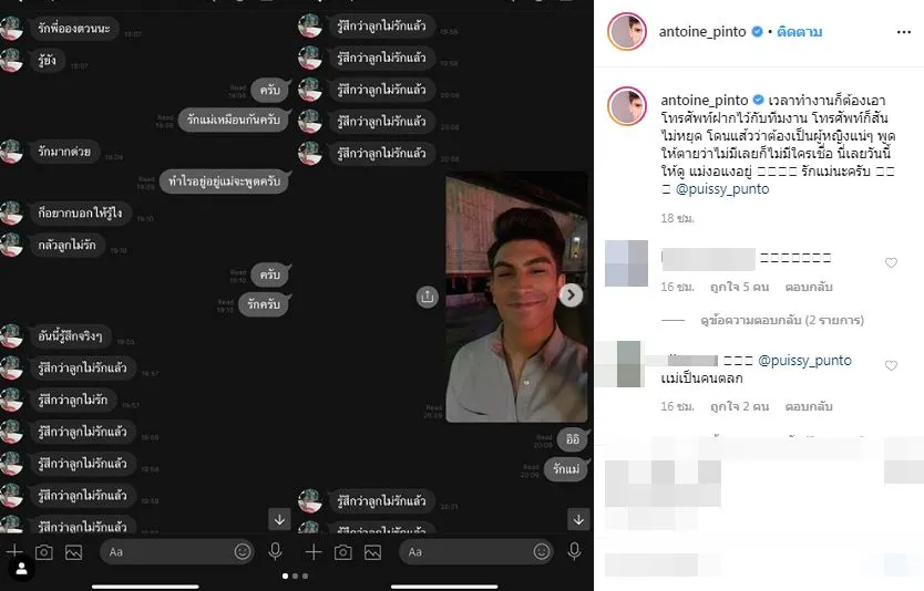 โดยหนุ่มอองตวน ได้โพสต์ภาพลงในอินสตาแกรมส่วนตัว พร้อมกับระบุข้อความว่า ” เวลาทำงานก็ต้องเอาโทรศัพท์ฝากไว้กับทีมงาน โทรศัพท์ก็สันไม่หยุด โดนแส้วว่าต้องเป็นผู้หญิงแน่ๆ พูดให้ตายว่าไม่มีเลยก็ไม่มีใครเชื่อ นี่เลยวันนี้ให้ดู แม่งอแงอยู่ รักแม่นะครับ @puissy_punto”
