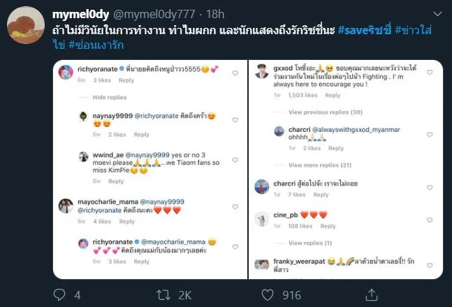 ทั้งนี้บนทวิตเตอร์ชาวเน็ตได้ผุด #saveริชชี่ขึ้น และได้มีการนำโพสต์ของนักแสดงรุ่นใหญ่หลายๆคนที่โพสต์ชื่นชมถึงริชชี่ตั้งแต่ยังไม่มีดราม่า พร้อมตั้งคำถามว่าถ้าน้องไม่ดีจริงทำไมมีแต่คนรัก