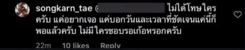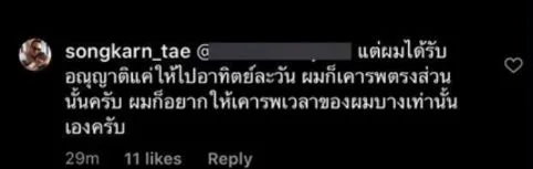 อีกทั้งทางด้าน หนุ่มสงกรานต์ และชาวเน็ตรายดังกล่าวก็ตอบโต้กันไปมา จนสุดท้าย หนุ่มสงกรานต์ ตอบกลับไปว่า แต่ผมได้รับอนุญาติแค่ให้ไปอาทิตย์ละวันผมก็เคารพตรงส่วนนั้นครับผมก็อยากให้เคารพเวลาของผมบ้างเท่านั้นเองครับ