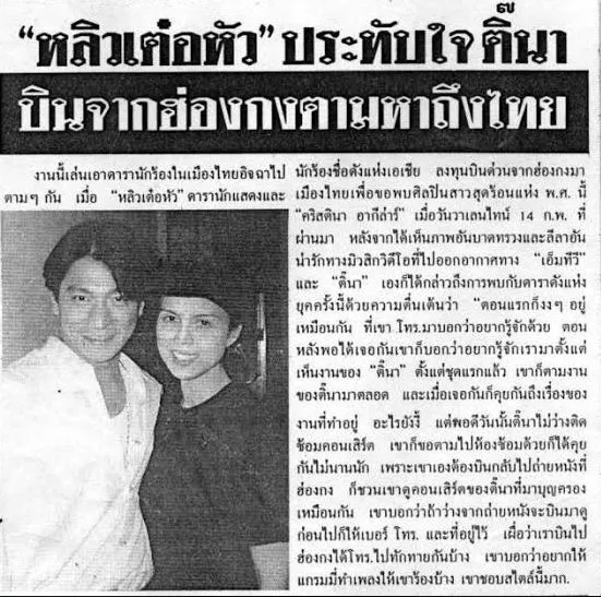 “อยากจะขอเจอเราหลายรอบ มาเป็นจดหมายมาที่บริษัท อยากจะขอเชิญไปดินเนอร์วันวาเลนไทน์ล่องเรือ เราก็คิดว่าไม่รู้จักเค้าจะไปนั่งกินข้าวด้วยไง ก็ไม่ไป เวลาผ่านไปนานมาก อยู่ดีๆ ก็นั่งคิดชื่อเค้า แล้วเสิร์จชื่อเค้า พอบอกไปว่าพ่อเค้าชื่อนี้ น้องสาวก็ตกใจถามว่าไม่รู้จักพ่อเค้าเหรอ ก็เลยรู้ว่าพลาดอีกแล้ว (ไมเคิล หว่อง ล่ะ?)มาเล่นมิวสิกให้ 2 เรื่อง แต่ไม่ได้เป็นแฟนกันนะคะ แต่เขาก็หล่อค่ะ”