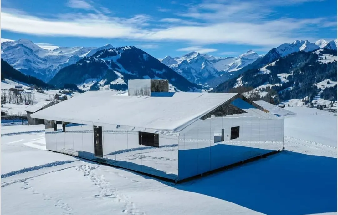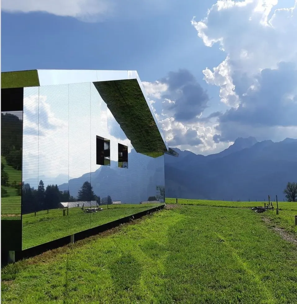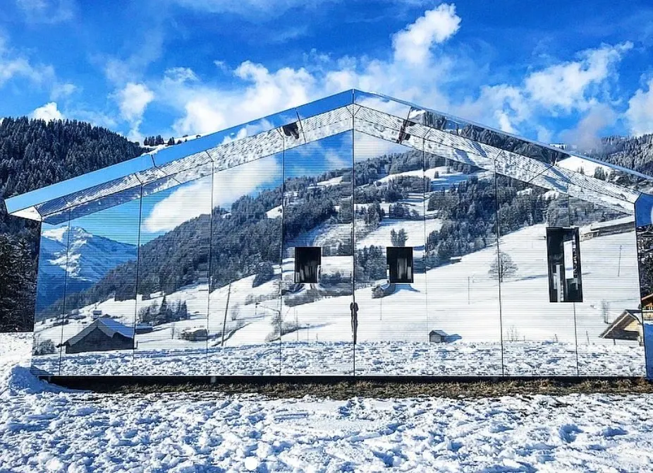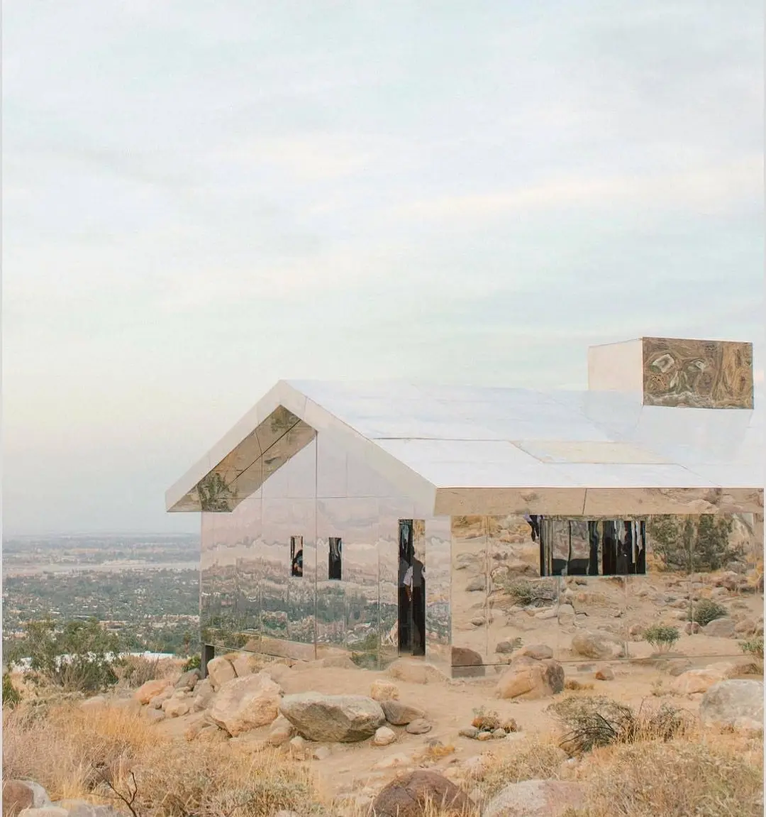 นักออกแบบ Doug Aitken สร้างบ้านมายากลมกัสจรรย์ ที่ทำจากกระจกทั้งหลัง. ทำให้มันดูกลมกลืนเข้ากับธรรมชาติ.