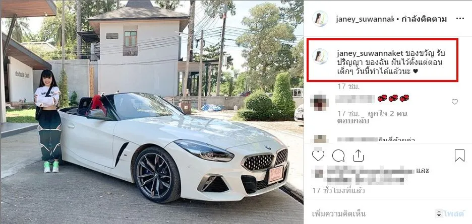 ซึ่ง สาวเจนี่ นั้นได้โพสต์ระบุข้อความว่า ของขวัญ รับปริญญา ของฉัน ฝันไว้ตั้งแต่ตอนเด็กๆ วันนี้ทำได้แล้วนะ
