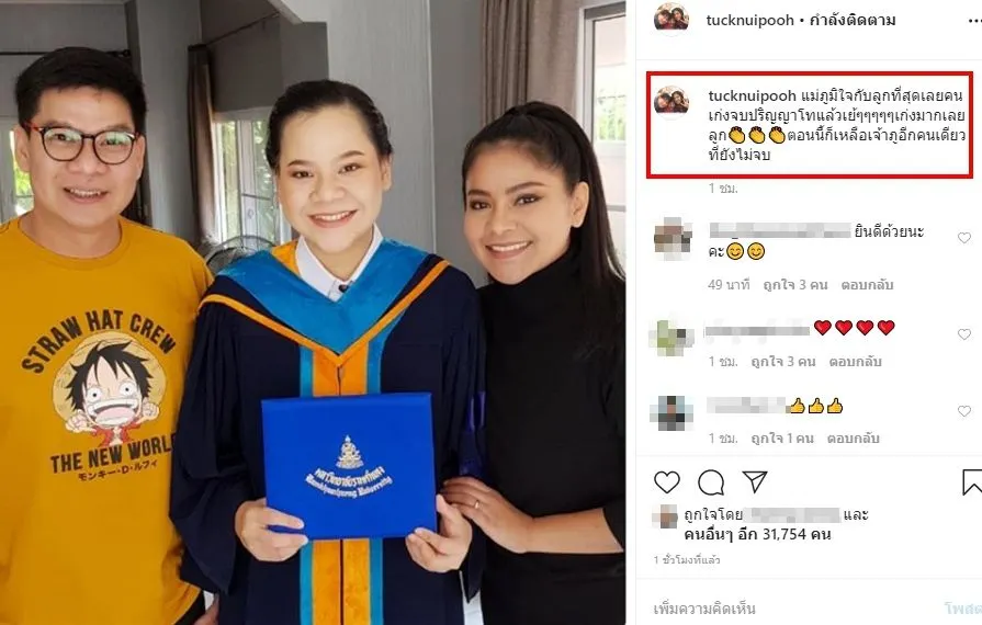 ทั้งนี้ล่าสุดทางด้าน “ตั๊ก ศิริพร”ได้โพสต์ภาพคู่ลูกสาวของภรรยาเก่า สามี “นุ้ย เชิญยิ้ม” ในชุดรับปริญญา พร้อมข้อความระบุว่า “แม่ภูมิใจกับลูกที่สุดเลยคนเก่งจบปริญญาโทแล้วเย้ๆๆๆๆๆเก่งมากเลยลูก ตอนนี้ก็เหลือเจ้าภูอีกคนเดียวที่ยังไม่จบ” งานนี้ทำเอาชาวเน็ตแห่ชื่นชมกันอย่างล้นหล้าม