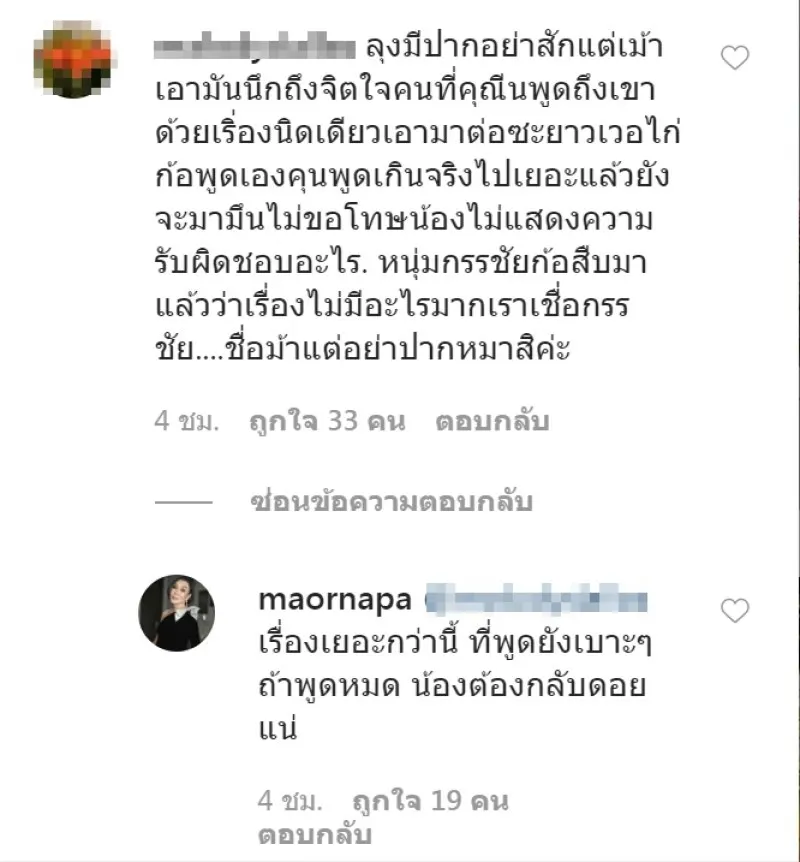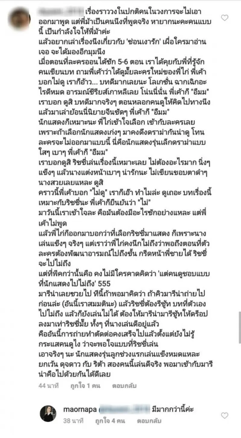 จากดราม่าแรงปมเปลี่ยนตัวละครเรื่อง ซ่อนเงารัก ทางช่อง 3 ของผู้จัดละคร ไก่ วรายุฑ หลังจากที่ ม้า อรนภา ออกมาแฉในรายการดังทำนองว่า สาเหตุที่เปลี่ยนตัวเป็นเพราะวินัยของ ริชชี่ อรเณศ คงทนกันไม่ไหวแล้ว ทำเอาพนักงานของผู้จัดถึงกับขอลาออก ซึ่งภายหลังก็ดูเหมือนว่าอะไรจะดีขึ้นเพราะ พี่ไก่ ขอเคลียร์ว่าสาเหตุเปลี่ยนตัวนักแสดงเพราะบทตามละครที่มีไว้ตั้งแต่แรก มีปัญหางานเป็นเรื่องปกติ ส่วนที่ ม้า อรนภา พูดในรายการ ไม่ใช่เรื่องจริงทั้งหมด ใส่ไข่เติมสีมากจนเกิดความจริง งานนี้หวยเลยมาตกที่ ม้า อรนภา ถูกชาวเน็ตและแฟนละครเข้าไปตำหนิเป็นจำนวนมาก อยากให้ขอโทษกับสิ่งที่พูดไปในรายการ ล่าสุด พี่ม้า เลยจัดหนักตอกหน้าชาวเน็ตกลับแบบแซบๆ บอกว่า มีเรื่องเยอะกว่านี้อีก เรื่องนี้แค่เบาๆ ถ้าพูดหมดเจ้าตัวอาจต้องกลับบ้านเก่า ดังภาพด้านล่าง