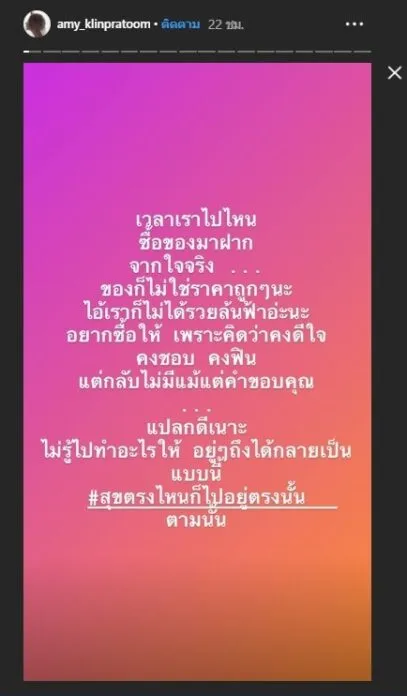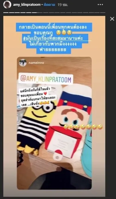 แต่ก็ไม่รู้งานนี้จะเกิดอะไรขึ้น เมื่อสาวเอมี่โพสต์ระบายความรู้สึกผ่านทางสตอรี่ไอจี หรือต้องการจะบอกถึงใครบางคน เนื่องจากเธอได้ซื้อของฝากมาจากต่างประเทศ แต่กลับไม่ได้รับคำขอบคุณ ทำเอาเจ้าตัวถึงกับงงว่าทำไมถึงกลายเป็นแบบนี้