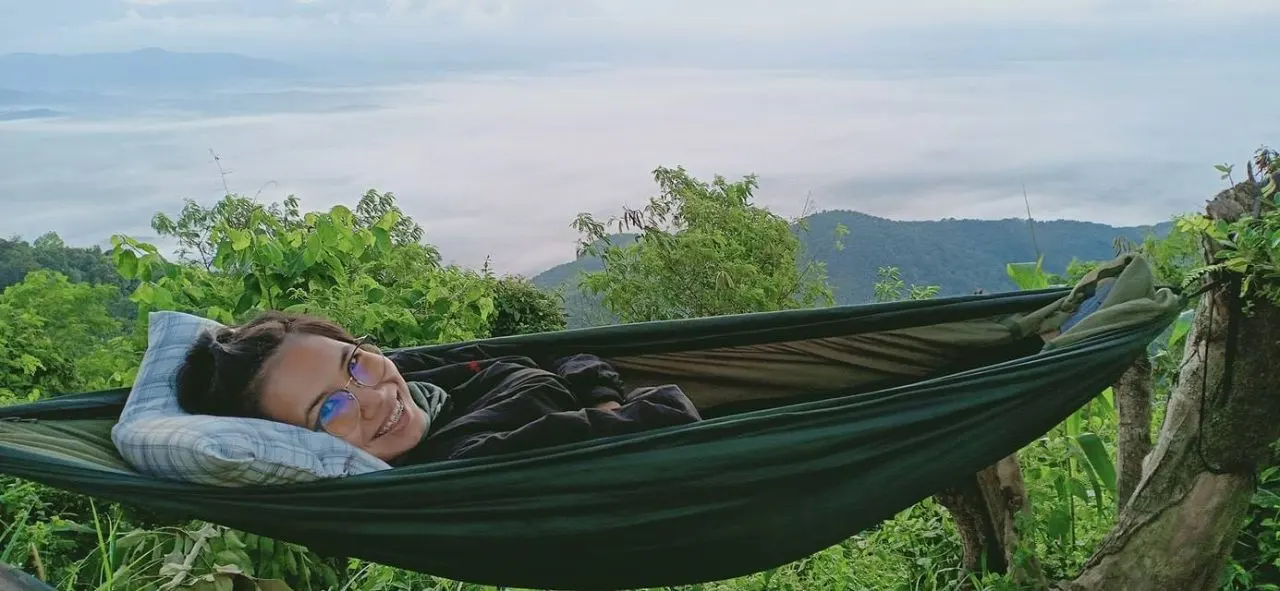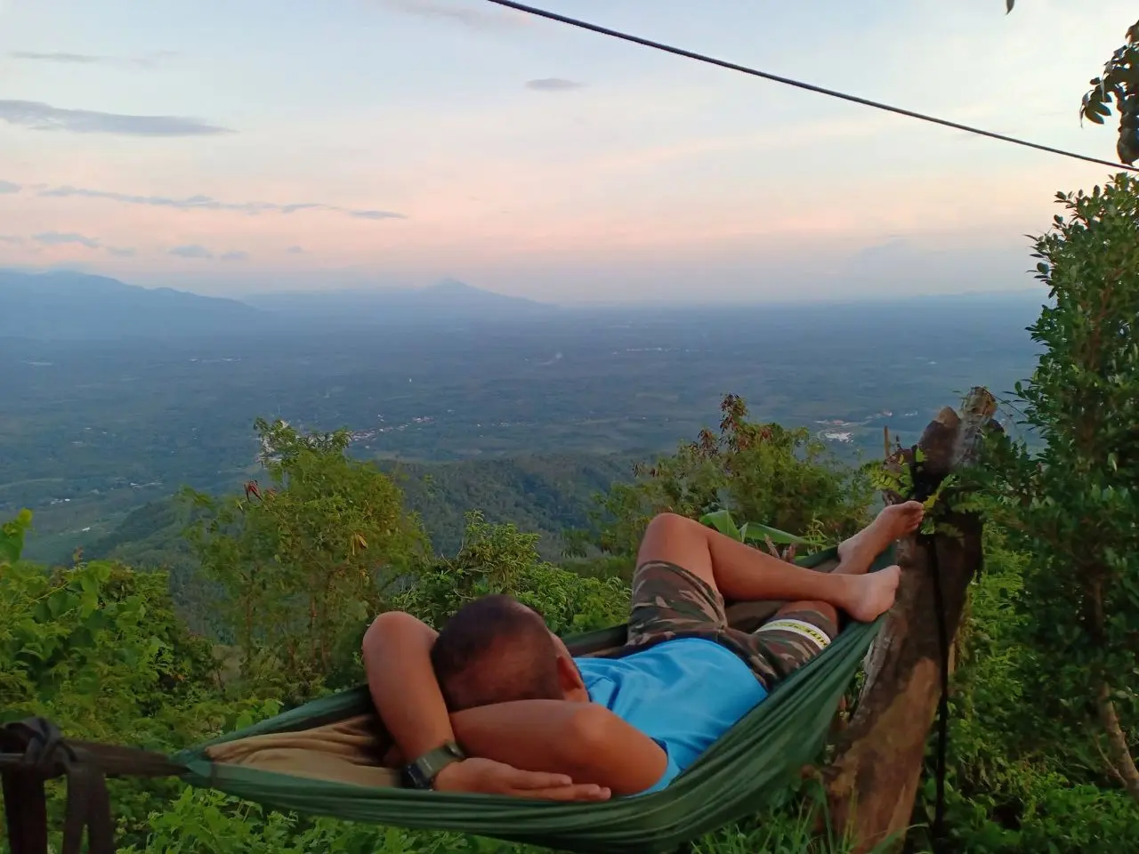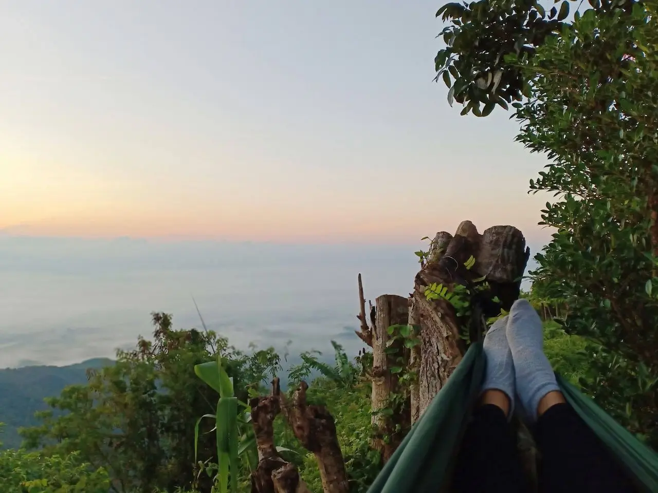 เราดั้นด้นผูกเปลเพื่อชมดาวในยามค่ำคืนและชมพระอาทิตย์ขึ้นในยามเช้า แต่ความพยายามเราคุ้มจริงๆฟินมาก แต่ไม่แนะนำ คนที่ไม่ถนัดอย่าทำตามนะจ๊ะกลัวอันตราย เพราะมุมล่างลงไปมี🌲 ให้ผูกเปลอยู่นะค่ะ
