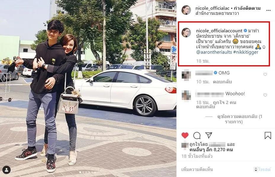 โดยงานนี้ สาวนิโคล ได้ระบุข้อความว่า มาทำบัตรประชาชน จาก ‘เด็กชาย่’ เป็น’นาย’ แล้วครับ ขอขอบคุณเจ้าหน้าที่เขตยานาวาทุกคนค่ะ @aarontheriaults#nikkitigge