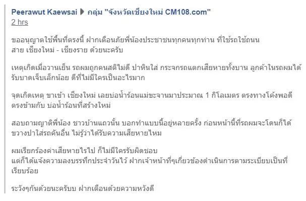 กรณีที่ทางผู้ใช้เฟซบุ๊คPeerawut Kaewsai ได้เผยเรื่องราวเตือนภัย เหตุการณ์ที่ไม่คาดคิดว่าจะเจอกับตนเอง ขณะเดินทางผ่านถนนเส้น เชียงใหม่ – เชียงราย ทำให้มีผู้ได้รับบาดเจ็บ โชคดีที่ไม่เกิดอุบัติเหตุร้ายเเรงตามมา