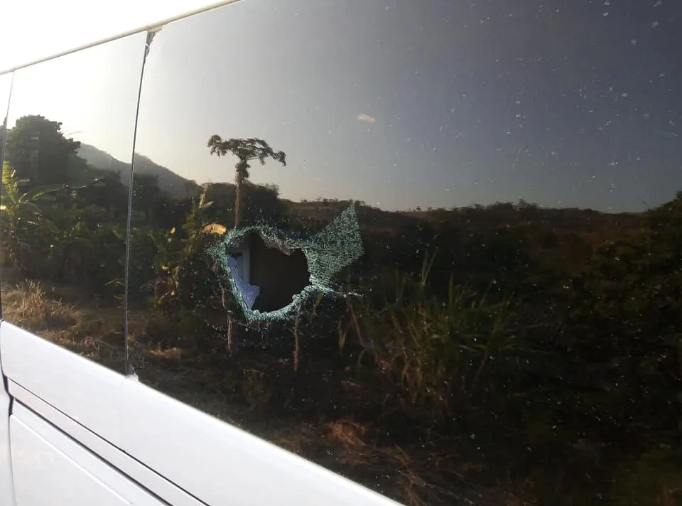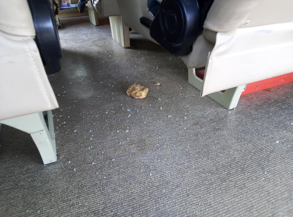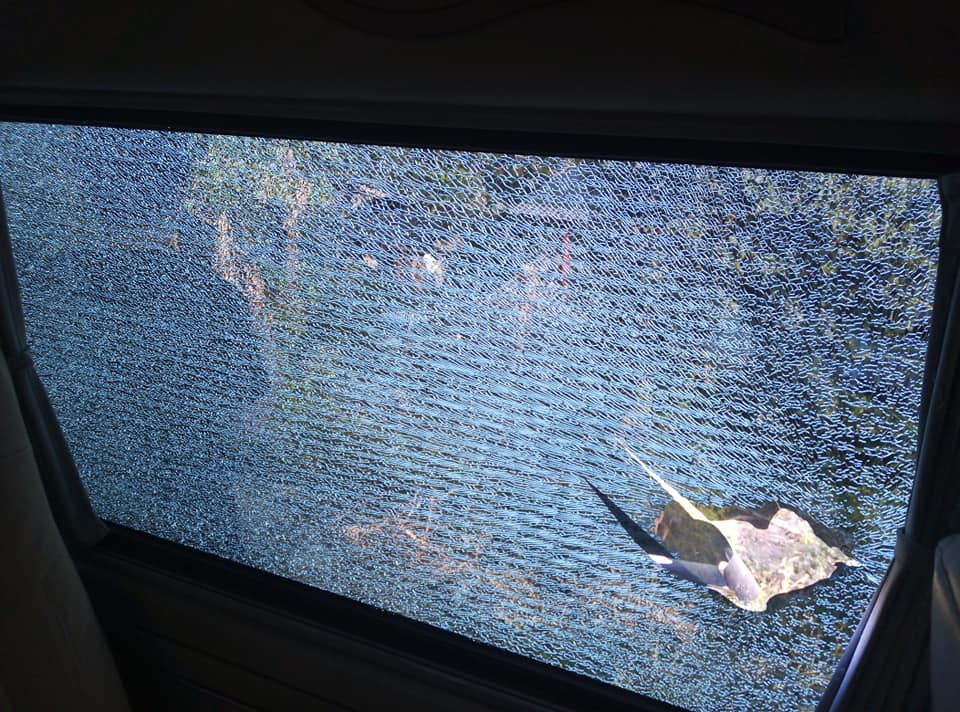 หนุ่มโพสต์เตือนภัย ถูกชายสติไม่ดีปาหินก้อนใหญ่ใส่รถตู้ ทำลูกค้าบาดเจ็บ