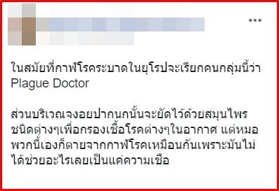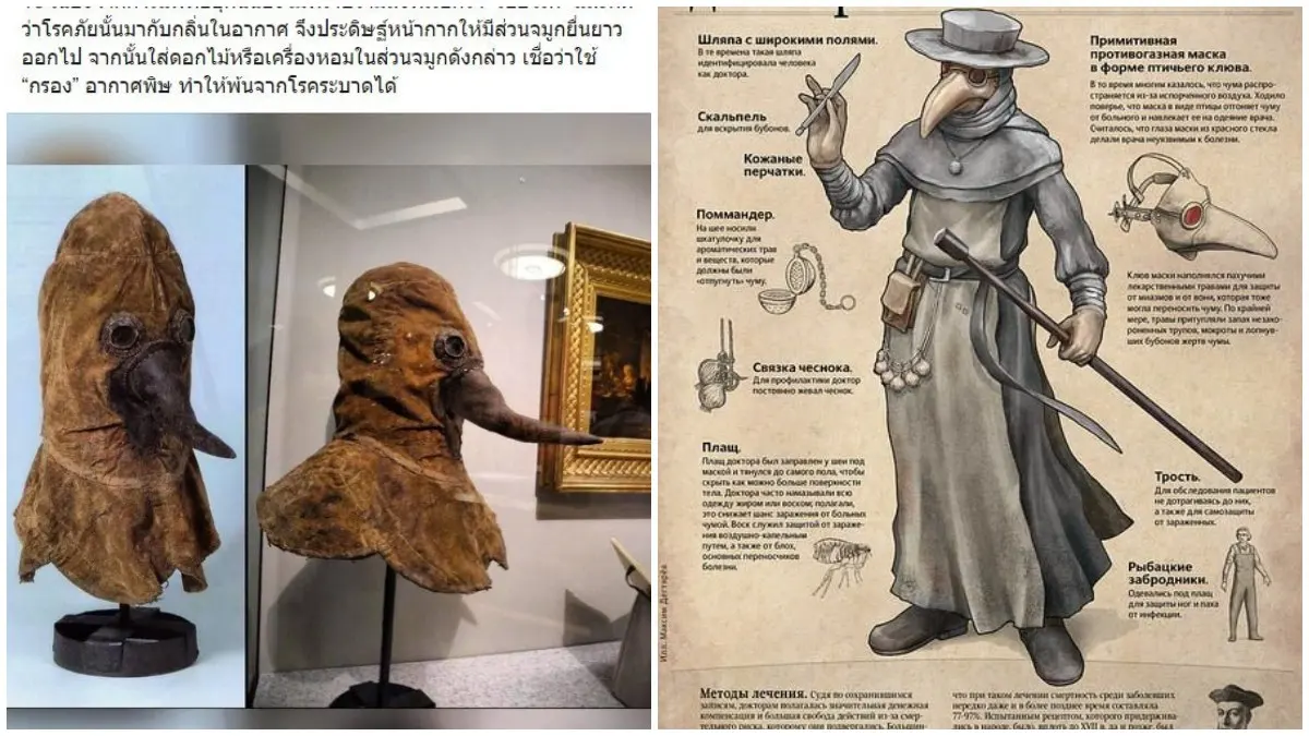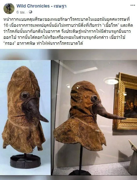 โดยได้โพสต์ข้อความไว้ว่า "หน้ากากแบบคลุมศีรษะของหมอรักษาโรคระบาดในเยอรมันยุคศตวรรษที่ 16 เนื่องจากการแพทย์ยุคนั้นยังไม่ทราบว่ามีสิ่งที่เรียกว่า “เชื้อโรค” และคิดว่าโรคภัยนั้นมากับกลิ่นในอากาศ จึงประดิษฐ์หน้ากากให้มีส่วนจมูกยื่นยาวออกไป จากนั้นใส่ดอกไม้หรือเครื่องหอมในส่วนจมูกดังกล่าว เชื่อว่าใช้ “กรอง” อากาศพิษ ทำให้พ้นจากโรคระบาดได้"