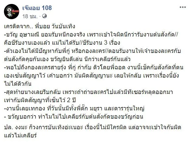 เพจดังสรุปบทสัมภาษณ์จาก บอย วันบันเทิง ถึงประเด็นดราม่า "ขวัญ อุษามณี" หนีกองละคร ซึ่งทั้งหมดนี้เป็นเรื่องของความเข้าใจผิดกัน