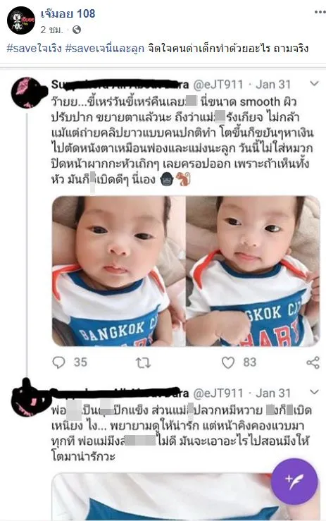เรียกว่าทำเอาชาวเน็ตต่างทนไม่ไหวหลังผู้ใช้งานทวิตเตอร์รายหนึ่งได้นำรูปน้องโนล่า ณเพชร ลูกสาวตัวน้อยของคุณแม่ เจนี่ อัลภาชน์ ณ ป้อมเพชร และ คุณพ่อ มิกกี้ นนท์ อัลภาชน์ ณ ป้อมเพชรมาทวิตด้วยข้อความไม่เหมาะสมจนทำให้ชาวเน็ตนั้นไม่พอใจเป็นอย่างมากกับข้อความของผู้ใช้ทวิตเตอร์รายนี้ จนทำให้เพจเจีมอย 108 ถึงขั้นทันไม่ไหวต้องออกมาsaveเจนี่และลูก พร้อมข้อความระบุว่า…”#saveใจเริง #saveเจนี่และลูก จิตใจคนด่าเด็กทำด้วยอะไร ถามจริง”