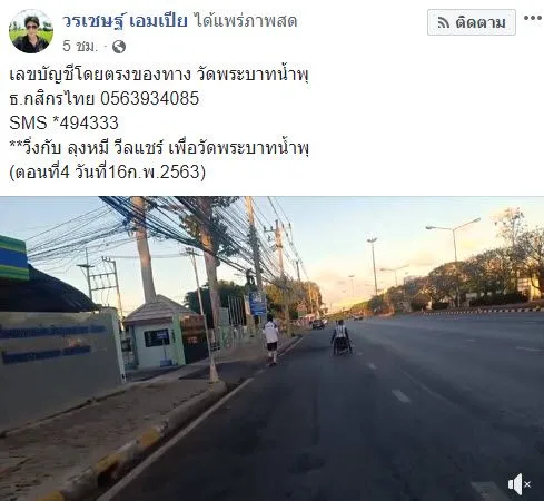 และล่าสุด เชษฐ์ สไมล์บัฟฟาโล ก็ได้โพสต์บนเฟซบุ๊กอีกครั้ง พร้อมทั้งระบุข้อความว่า “เลขบัญชีโดยตรงของทาง วัดพระบาทน้ำพุ ธ.กสิกรไทย 0563934085 SMS *494333 วิ่งกับ ลุงหมี วีลแชร์ เพื่อวัดพระบาทน้ำพุ (ตอนที่4 วันที่16ก.พ.2563)” ซึ่งทำให้ชาวเน็ตเข้ามาร่วมทำบุญและอนุโมทนาบุญเป็นจำนวนไม่น้อย (คลิกเพื่อชมคลิป)
