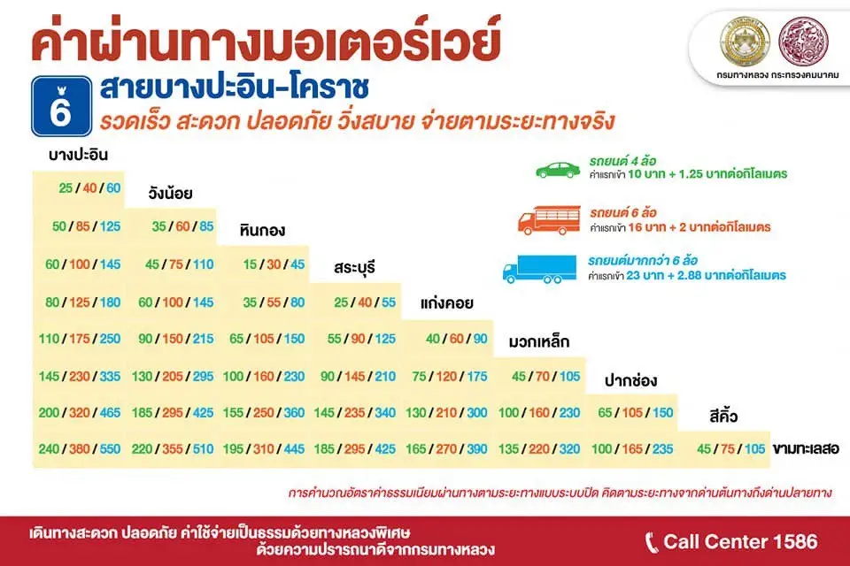 อัตราค่าผ่านทางทางหลวงพิเศษหมายเลข 6 สายบางปะอิน-นครราชสีมา ระยะทาง 196 กิโลเมตร