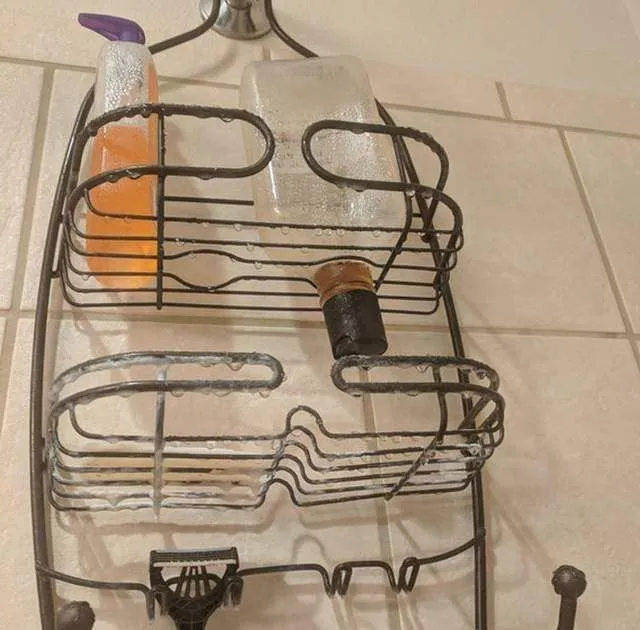 2 ชั้นวางของในห้องอาบน้ำมีรูสำหรับวางขวดคว่ำลงเมื่อของเหลวใกล้หมด
