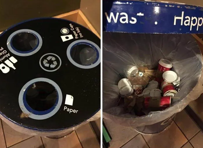 1. ถังขยะรีไซเคิล ที่มีช่องให้แยกขยะ แต่สุดท้ายก็ไปกองรวมกันเหมือนเดิม