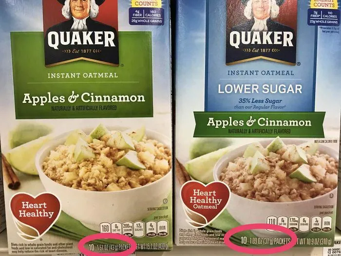 3. อาหารเช้าสูตร “น้ำตาลลดลง 35%” จริงๆ แล้วลดปริมาณอาหารในกล่องลง 35% แหงล่ะน้ำตาลที่เราได้กินมันก็ต้องลดอยู่แล้ว เพราะปริมาณมันลดลงนี่นา ที่ร้ายกว่านั้นคือขายราคาเดิม