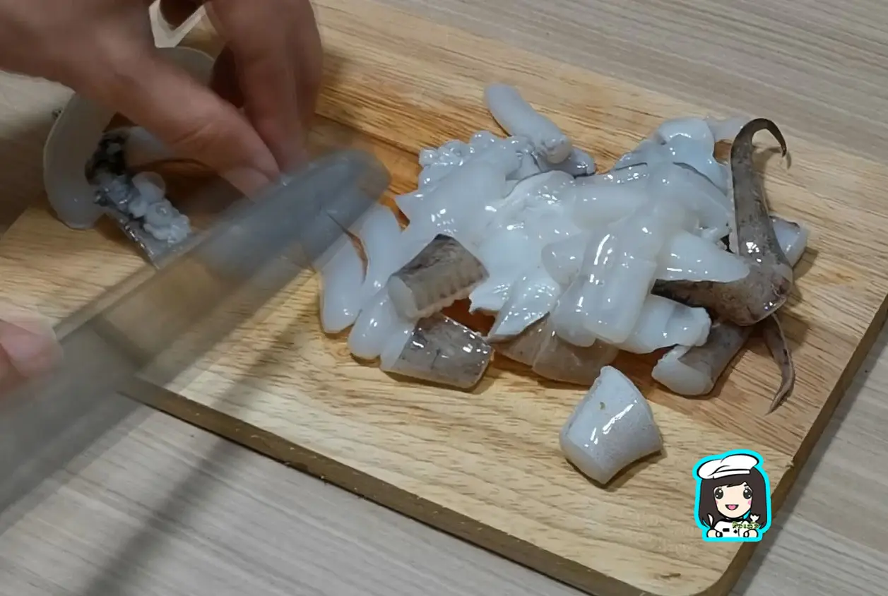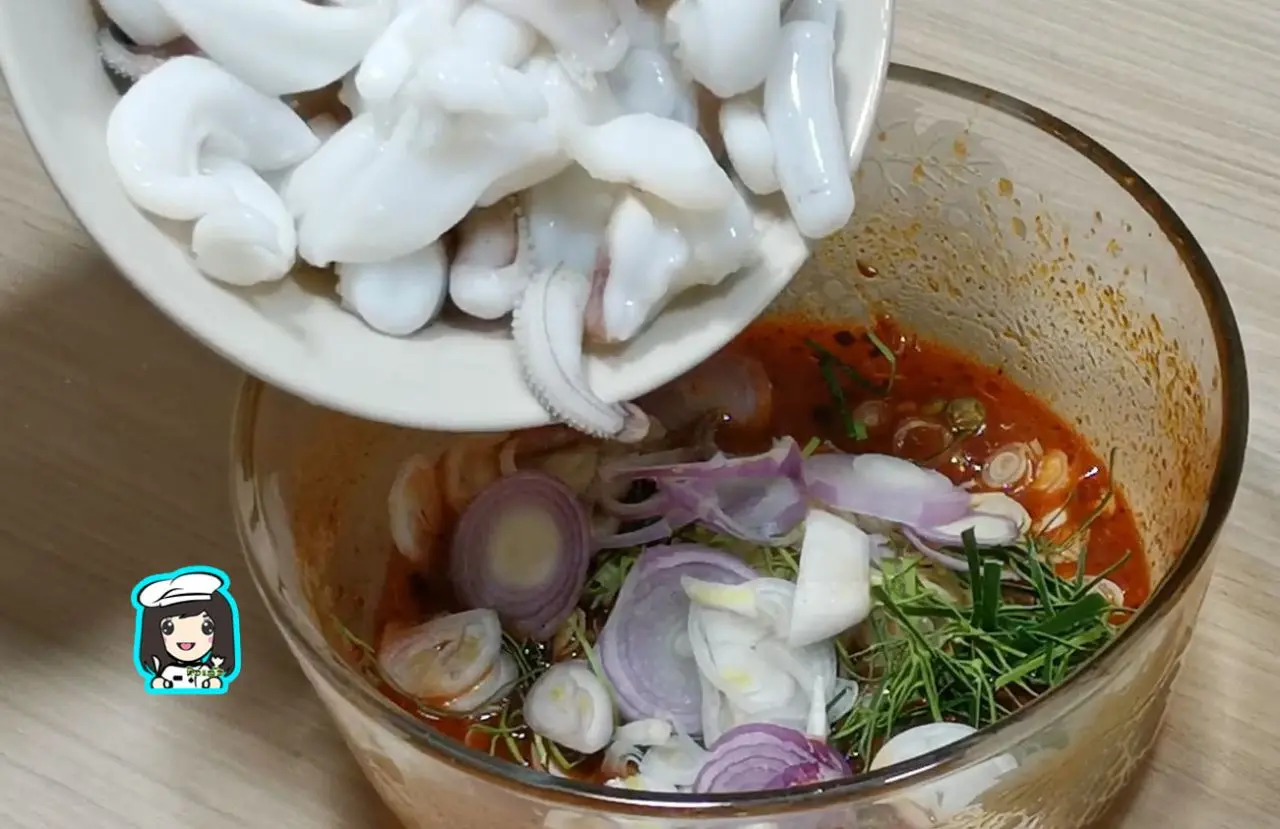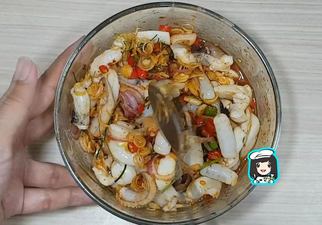 1.นำหนวดปลาหมึกขยำกับเกลือป่นแช่น้ำไว้ 15 นาที จากนั่นล้างน้ำทิ้ง รินน้ำส้มสายชูใส่ชามนำปลาหมึกลงขยำสักพัก แล้วนำไปล้างผ่านน้ำหลายๆรอบจนหมดกลิ่น