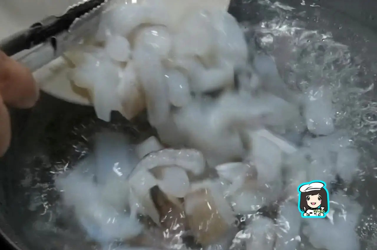 2.หั่นหนวดปลาหมึกยาวขนาดพอดีคำ ตั้งน้ำให้เดือดจัด นำหนวดปลาหมึกลงลวก ลวกแค่พอสุกตักขึ้นน๊อกน้ำเย็นทันที พักให้สะเด็ดน้ำ