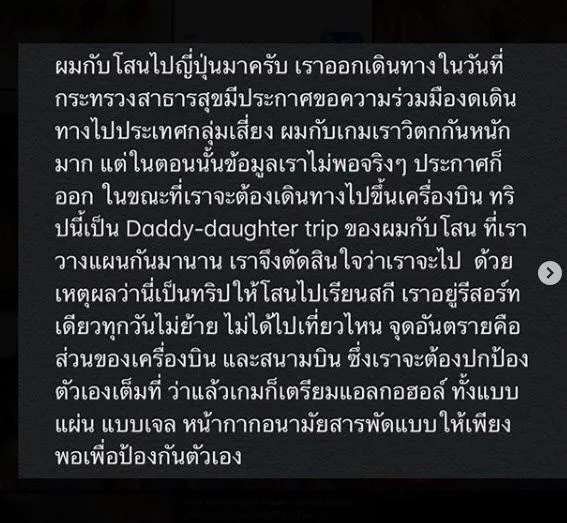 ในไอจี ผมกับโสนไปญี่ปุ่นมาครับ เราออกเดินทางในวันที่กระทรวงสาธารสุขมีประกาศขอความร่วมมืองดเดินทางไปประเทศกลุ่มเสี่ยง ผมกับเกมเราวิตกกันหนักมาก แต่ในตอนนั้นข้อมูลเราไม่พอจริงๆ ประกาศก็ออก ในขณะที่เราจะต้องเดินทางไปขึ้นเครื่องบิน ทริปนี้เป็น Daddy-daughter trip ของผมกับโสน ที่เราวางแผนกันมานาน เราจึงตัดสินใจว่าเราจะไป ด้วยเหตุผลว่านี่เป็นทริปให้โสนไปเรียนสกี เราอยู่รีสอร์ทเดียวทุกวันไม่ย้าย ไม่ได้ไปเที่ยวไหน จุดอันตรายคือส่วนของเครื่องบิน และสนามบิน ซึ่งเราจะต้องปกป้องตัวเองเต็มที่ ว่าแล้วเกมก็เตรียมแอลกอฮอล์ ทั้งแบบแผ่น แบบเจล หน้ากากอนามัยสารพัดแบบให้เพียงพอเพื่อป้องกันตัวเอง