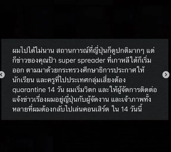 ผมไปได้ไม่นาน สถานการณ์ที่ญี่ปุ่นก็ดูปกติมากๆ แต่ก็ข่าวของคุณป้า super spreader ที่เกาหลีใต้ก็เริ่มออก ตามมาด้วยกระทรวงศึกษาธิการประกาศให้นักเรียน และครูที่ไปประเทศกลุ่มเสี่ยงต้อง quarantine 14 วัน ผมเริ่มวิตก และให้ผู้จัดการติดต่อแจ้งข่าวเรื่องผมอยู่ญี่ปุ่นกับผู้จัดงาน และเจ้าภาพทั้งหลายที่ผมต้องกลับไปเล่นคอนเสิร์ต ใน 14 วันนี้ เนื่องจากผมมีความเห็นว่า ผมต้องรับผิดชอบต่อสังคมหลายๆส่วนด้วยการ quarantine ตัวเอง 14 วัน ซึ่งผู้จัดบางรายได้ตัดสินใจเลื่อนงานออกไปเลย เนื่องจากไม่ต้องการเพิ่มความเสี่ยงด้วยการให้คนจำนวนมากมารวมกัน (ซึ่งผมมีความเห็นว่า หากไม่เดือดร้อนในส่วนไหน วิธีการนี้เป็นวิธีการควบคุมความเสี่ยงที่ดีมาก)