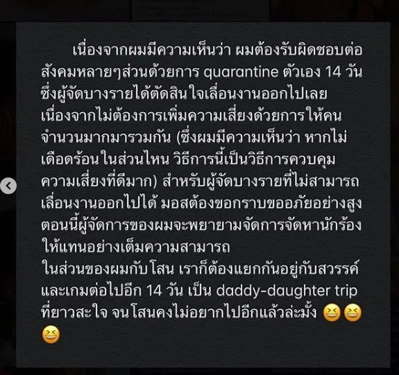 สำหรับผู้จัดบางรายที่ไม่สามารถเลื่อนงานออกไปได้ มอสต้องขอกราบขออภัยอย่างสูง ตอนนี้ผู้จัดการของผมจะพยายามจัดการจัดหานักร้องให้แทนอย่างเต็มความสามารถในส่วนของผมกับโสน เราก็ต้องแยกกันอยู่กับสวรรค์และเกมต่อไปอีก 14 วัน เป็น daddy-daughter trip ที่ยาวสะใจ จนโสนคงไม่อยากไปอีกแล้วล่ะมั้ง