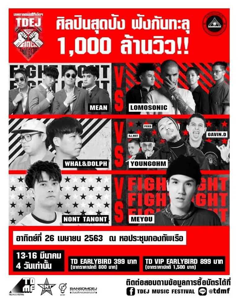 TDEJ MUSIC FESTIVAL ครั้งที่ 6 #TDMF6 โดยโปรดิวเซอร์คนบันเทิง EntLab ที่ทุ่มทุนสร้าง รวมพลคนดนตรีสุดแสบแห่งปี ร่วมมาประชันสู้ผ่านศึกดนตรี อาทิ Mean, Lomosonic, Whal & Dolph, Youngohm x Fiixd, Gavin.D x DJ.Nut, Nont Tanont, Meyou, Thaitong, DJ.Fuse Kitti ฯลฯ มาสร้างการต่อสู้ผ่านเสียงเพลงบนเวทีที่พร้อมระเบิดความมันส์แก่ผู้ชมอย่างเต็มที่ #ยกนี้ไฟต์ชัวร์ ในวันอาทิตย์ที่ 26 เมษายนนี้ ณ หอประชุมกองทัพเรือ ตั้งแต่เวลา 14.00 น. เป็นต้นไป ติดตามรายละเอียดเพิ่มเติมและข้อมูลการซื้อบัตรได้ ที่ TDMF TICKET โทร 093-849-2653 / 089-691-2615 /088-684-9600 หรือสอบถามข้อมูลเพิ่มเติมได้ที่ Line : @tdmf, FB : TDej Music Festival