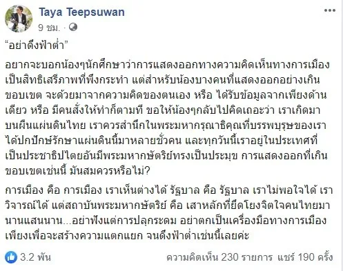 นางทยา ทีปสุวรรณ อดีตแกนนำ กปปส. และภรรยาของ นายณัฏฐพล ทีปสุวรรณ รองหัวหน้าพรรคพลังประชารัฐ โพสต์เฟซบุ๊กส่วนตัว Taya Teepsuwan โยงนักศึกษาชุมนุมมีนัยยะต่อต้านสถาบัน โดยพูดทำนองว่านักศึกษาเป็นกลุ่มล้มเจ้า