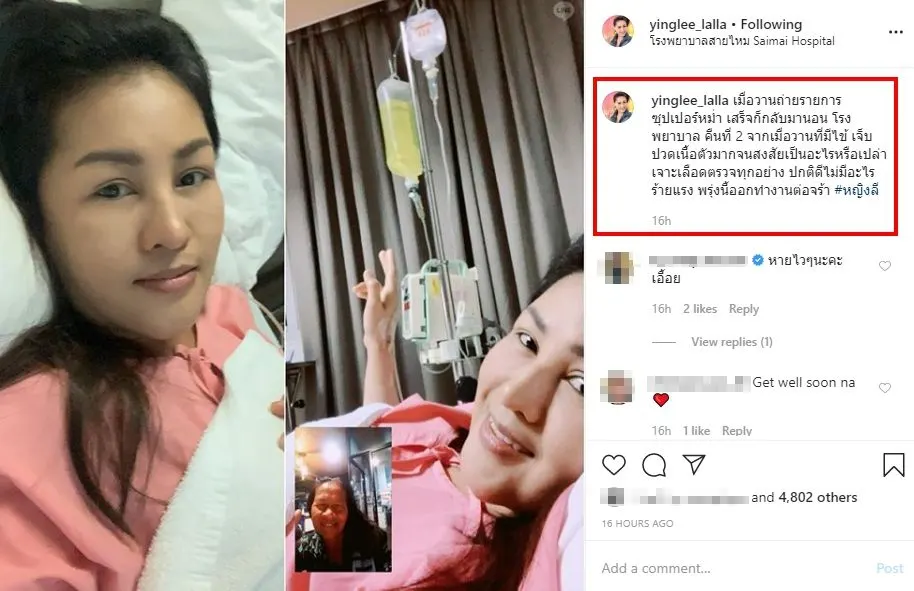 “เมื่อวานถ่ายรายการ ซุปเปอร์หม่ำ เสร็จก็กลับมานอน โรงพยาบาล คืนที่ 2 จากเมื่อวานที่มีไข้ เจ็บปวดเนื้อตัวมากจนสงสัยเป็นอะไรหรือเปล่า เจาะเลือดตรวจทุกอย่าง ปกติดีไม่มีอะไรร้ายแรง พรุ่งนี้ออกทำงานต่อจร้า #หญิงลี”