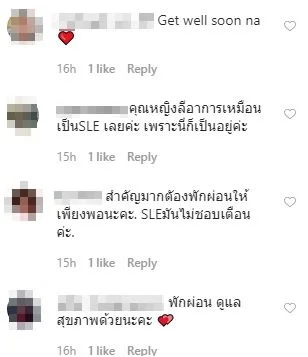 งานนี้ก็มีเหล่าแฟนคลับแห่ให้กำลังใจอย่างล้นหล้าม อาทิ “หายไวๆนะ” , “สำคัญมากตัองพักผ่อนให้เพียงพอนะคะ. SLEมันไม่ชอบเตือนค่ะ”, “พักผ่อน ดูแลสุขภาพด้วยนะคะ”