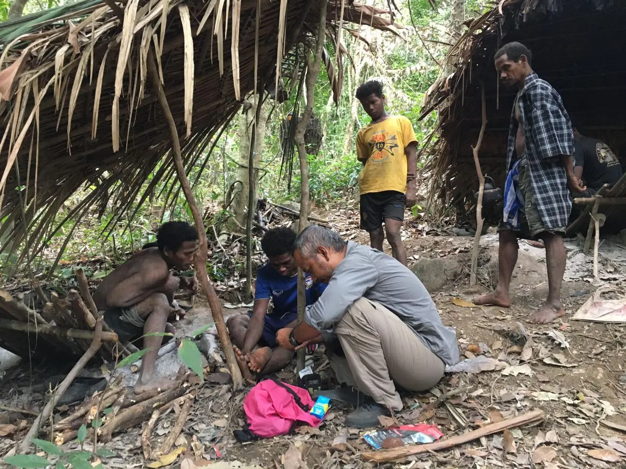 "เฒ่าธง" ชายหนุ่มมันนิบอกว่าเป็นแผลมียาที่ใช้แล้วหายไหม ทางทีมงานเลยใช้แอลกอฮอร์ล้างแผลแล้วใช้พลาสเตอร์ติดแผลไว้ให้ (เนื่องจากขึ้นเขาทางเรามีอุปกรณ์การแพทย์ไม่ครบจึงรักษาเท่าที่มี)
