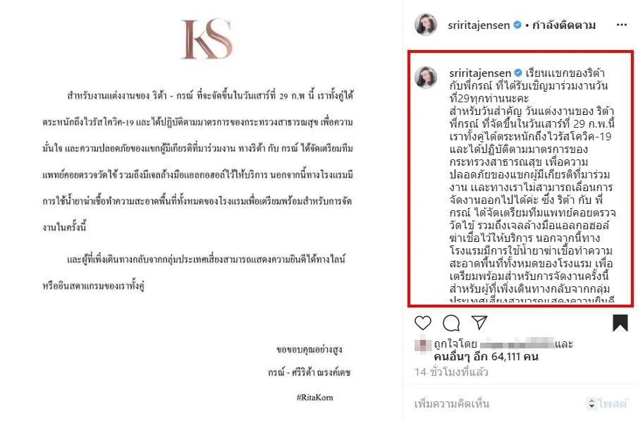 ศรีริต้า เจ้าสาวหมื่นล้าน ประกาศกลางไอจี ผู้เดินทางกลับจากประเทศเสี่ยง โควิด 19 งดร่วมแสดงความยินดีในงานเเต่ง ขอให้ยินดีผ่านโซเชียล!