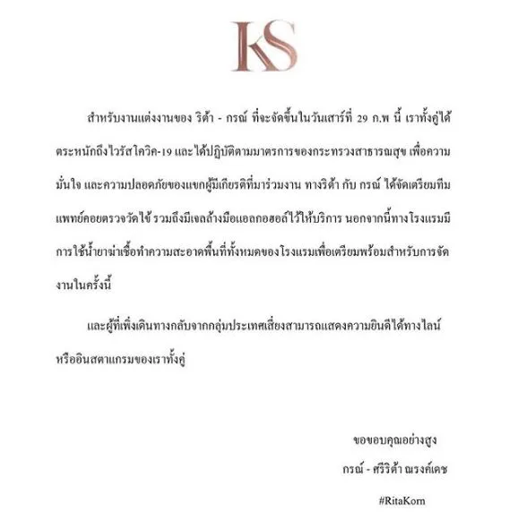 โดยงานนี้ สาวศรีริต้า นั้นได้ระบุข้อความว่า เรียนเเขกของริต้า กับพี่กรณ์ ที่ได้รับเชิญมาร่วมงานวันที่29ทุกท่านนะคะ สำหรับวันสําคัญ วันแต่งงานของ ริต้า พี่กรณ์ ที่จัดขึ้นในวันเสาร์ที่ 29 ก.พ.นี้ เราทั้งคู่ได้ตระหนักถึงไวรัสโควิค-19 และได้ปฏิบัติตามมาตรการของกระทรวงสาธารณสุข เพื่อความปลอดภัยของแขกผู้มีเกียรติที่มาร่วมงาน เเละทางเราไม่สามารถเลื่อนการจัดงานออกไปได้ค่ะ ซึ่ง ริต้า กับ พี่กรณ์ ได้จัดเตรียมทีมแพทย์คอยตรวจวัดไข้ รวมถึงเจลล้างมือแอลกอฮอล์ฆ่าเชื่อไว้ให้บริการ นอกจากนี้ทางโรงแรมมีการใช้น้ำยาฆ่าเชื้อทำความสะอาดพื้นที่ทั้งหมดของโรงแรม เพื่อเตรียมพร้อมสำหรับการจัดงานครั้งนี้ สำหรับผู้ที่เพิ่งเดินทางกลับจากกลุ่มประเทศเสี่ยงสามารถแสดงความยินดีได้ทางไลน์หรืออินสตาแกรมของเราทั้งคู่นะคะ ขอขอบพระคุณ อย่างสูงค่ะ ริต้า – กรณ์