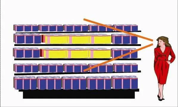 คนส่วนใหญ่มักตัดสิ่นใจซื้อของที่อยู่ที่ระดับสายตา ดังนั้นของที่ว่างขายในระดับสายตาก็มักจะมีราคาแพงกว่าของที่วางนอกระดับสายตา อีกทั้งถ้าเป็นพวกของที่เด็กๆ ชอบ ซุปเปอร์มาร์เก็ต ก็จะจงใจวางของที่มีราคาแพงไว้อยู่ที่ระดับสายตาเด็กอีกด้วย เพื่อจะให้เด็กๆ ทำการตื้อพ่อแม่ให้ซื้อให้ (ช่างแยบยลจริงๆ)