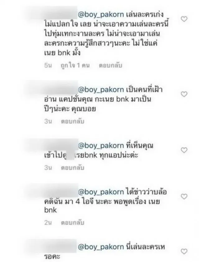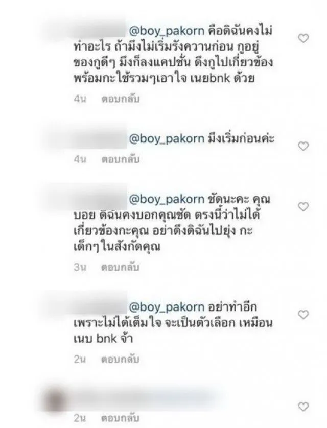โดยคอมเมนต์ต่อว่าในทำนองเป็นผู้หญิงที่ถูกหนุ่มบอยทิ้ง แล้วไปตามจีบ เนย BNK48 พร้อมทั้งบอกด้วยว่า เฝ้าอ่านแคปชั่นระหว่าง บอย และ เนย มาเป็นปีๆแล้ว ไม่เต็มใจที่จะเป็นตัวเลือก