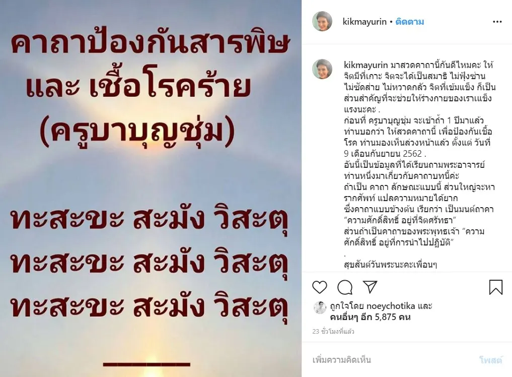 ต้องบอกว่าตอนนี้ประเทศไทยตื่นตัวกับไวรัสโควิด – 19 เป็นอย่างมากต่างหาหน้ากากมาใส่เพื่อป้องกันโรค ไม่เดินทางไปประเทศกลุ่มเสี่ยงพร้อมทั้งทำสุขภาพให้แข็งแรงอยู่ตลอดเวลาเพื่อสุขภาพจะได้ไม่อ่อนแอจนทำให้ภูมิต้านทานลดลง ล่าสุดนักแสดงสาวสายบุญอย่าง กิ๊ก มยุริญ ได้ขอออกมาเผยแพร่ บทคาถาป้องกันสารพิษและเชื้อโรคร้าย ที่เป็นคาถาดังจาก “ครูบาบุญชุ่ม” เพื่อให้จิตใจเข้มแข็งและตั้งมั่นอยู่ตลอดเวลา