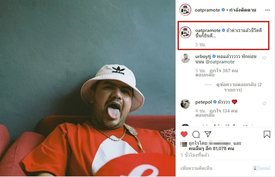 หลังจากที่ สาวเเพท ได้เปิดตัวเเฟนหนุ่มไปอย่างเป็นทางการ ทางด้าน โอ๊ต ปราโมทย์ ก็ถูกโยงเข้าไปเอี่ยวดราม่าเเบบเต็มๆ ทั้งถูกวิพากษ์วิจารณ์อย่างหนักในโลกโซเชียล ไม่ว่าจะเป็นไอจี เฟซบุ๊ค หรือ ทวิตเตอร์ จากนั้น โอ๊ต ปราโมทย์ นั้นก็สุดจะทน โพสต์ตัดพ้อกลางไอจี ว่า ถ้าด่าเราแล้วชีวิตดีขึ้นก็ยินดี…