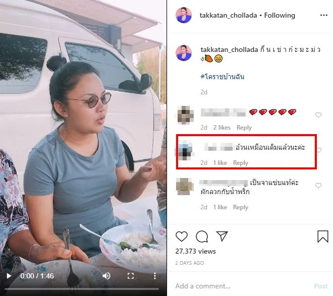 ทั้งนี้ล่าสุด “สาวตั๊กแตน” ได้โพสต์คลิปขณะทานข้าวกับญาติๆพี่ๆน้องๆที่ จ.โคราช แต่ดันมีชาวเน็ตคอมเม้นต์วิจารณ์ ในรูปร่างของเธอ ด้วยข้อความระบุว่า “อ้วนเหมือนเดิมแล้วนะค่ะ” งานนี้ไม่รู้ว่า”สาวตั๊กแตน” จะรู้สึกยังไง แต่ที่แน่ๆยังการันตีความแซ่บและความสวยแน่นอน!