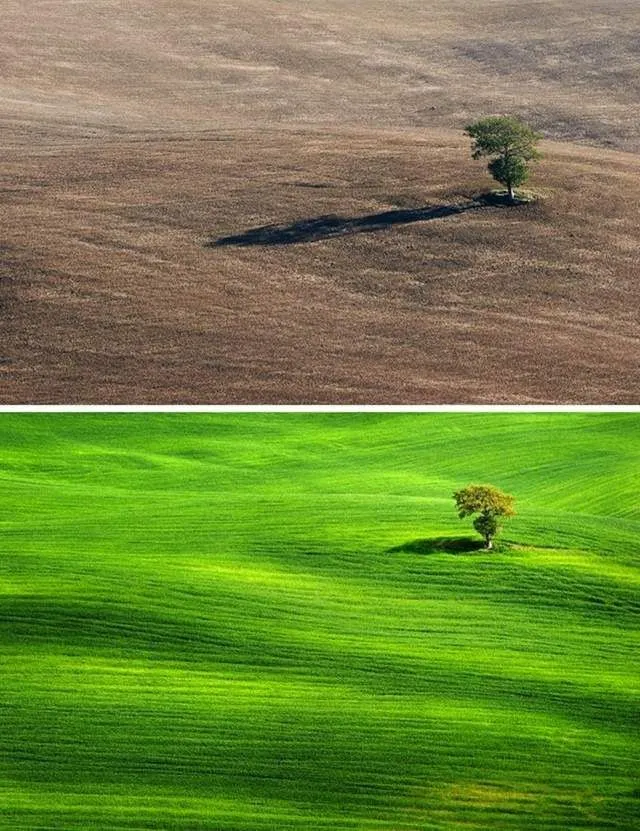 #13 ทุ่งหญ้าในทัสกานี แคว้นหนึ่งของประเทศอิตาลี ในฤดูแล้งกับฤดูที่ต้นหญ้าเขียวชอุ่ม