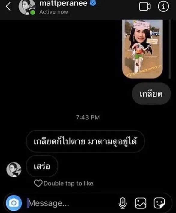 ซึ่งก่อนหน้านี้ทางด้าน สาวแมท ได้ออกมาสวนกลับแบบจุกๆหลังโดนชาวเน็ตเข้าไปต่อว่าทางอินสตาแกรมเอาไว้ว่า เกลียด งานนี้ทางด้าน สาวแมทเลยสวนกลับแบบจุกๆไปว่า เกลียดก็ไปตายมาตามดูอยู่ได้เสร่อ ทำเอาเกิดเสียงวิพากษ์วิจารณ์กันอย่างมากมายเลยทีเดียว